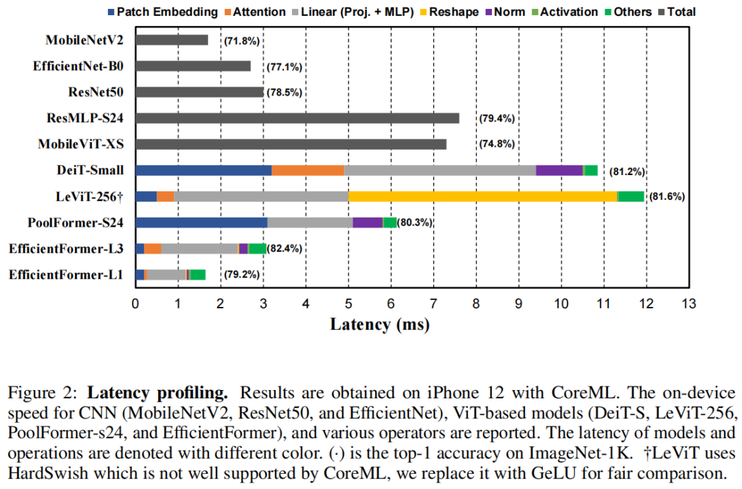 Patch embedding通常使用具有较大kernel-size和stride的非重叠卷积层来实现。一个普遍的看法是,transformer 网络中Patch embedding的计算成本不显着或可以忽略不计。然而,在图 2 中比较了具有大kernel和stride的Patch embedding模型,即 DeiT-S 和 PoolFormer-s24,以及没有它的模型,即 LeViT-256 和 EfficientFormer,表明Patch embedding反而是移动设备上的速度瓶颈。