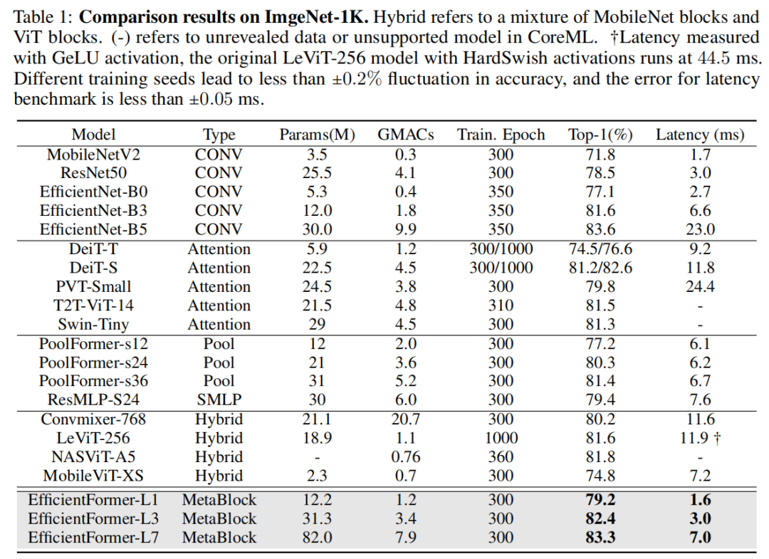 ViT的模型中使用的网络架构和ViT算子,并确定其低效的设计。然后引入了一个维度一致的纯Transformer(没有MobileNet Block)作为设计范式。最后,执行延迟驱动的瘦身以获得一系列最终模型,称为EfficientFormer。大量实验表明