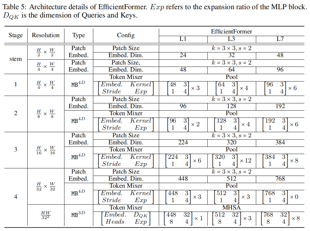 该网络包括 4 个阶段。在每个阶段中,都有一个嵌入操作来投影嵌入维度和下采样Token长度,在图 3 中表示为嵌入。在上述架构下,EfficientFormer 是一个完全基于Transformer的模型,没有集成 MobileNet 结构。
