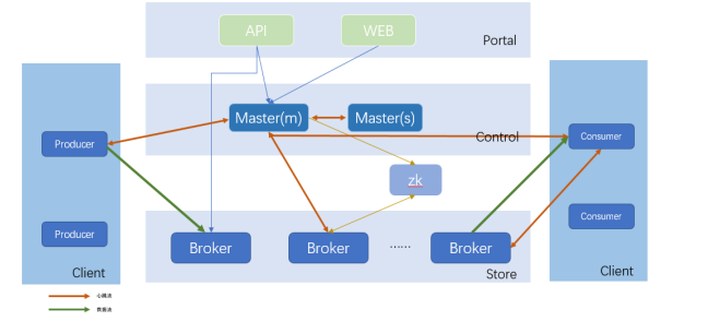 (GitHub地址:https://GitHub.com/Tencent/TubeMQ/)是腾讯自研的分布式消息中间件系统(MQ),其擅长进行海量数据的存储和传输,相较其它主流MQ组件,TubeMQ所经历的考验可谓是最多的,毕竟最高日交易量33万亿的数据摆在这里,笔者相信在TubeMQ今后会迅速取代Kafka成为MQ软件系的新C位。其架构图如下: