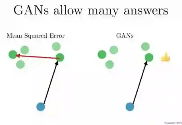 我们来考虑以下任务:将蓝色输入点映射到绿色输出点(绿点可能是蓝点的输出)。这个红色箭头表示预测的误差,也意味着经过一段时间后,蓝点将被映射到绿点的平均值——这一精确映射将会模糊我们试图预测的图像。