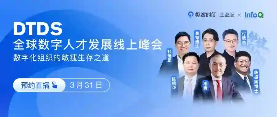 3 月 31 日,由极客时间企业版联合 InfoQ 极客传媒共同举办的 DTDS 全球数字人才发展线上峰会,将邀请来数字化先锋专家和数字人才发展带头人,带来领先企业的数字化发展经验、数字化组织敏捷转型、人才梯队搭建等精彩演讲。