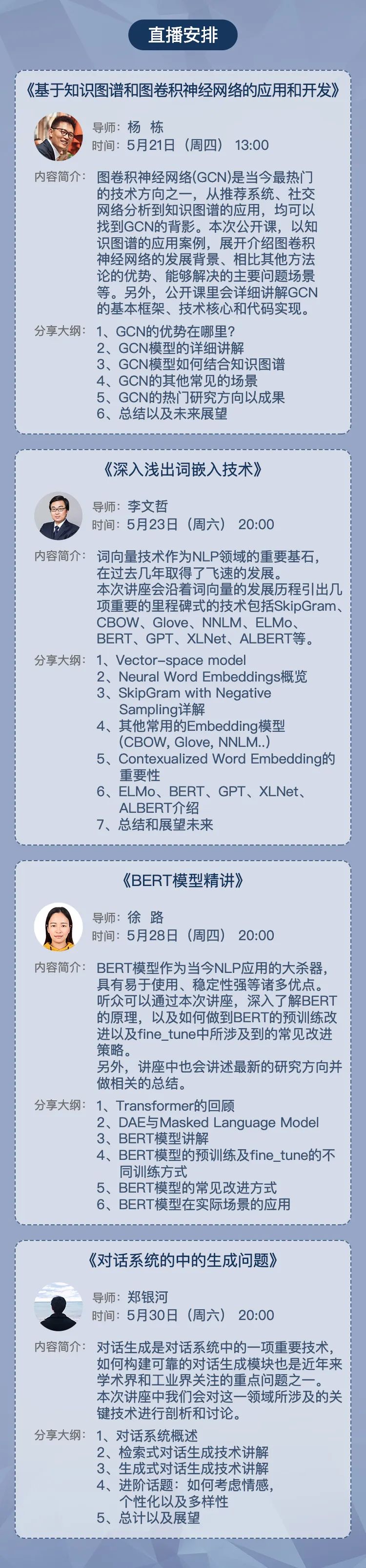 包括GNN, GCN, Word2Vec, ELMo, GPT, BERT, 对话系统,个性化文本生成,知识图谱等内容。