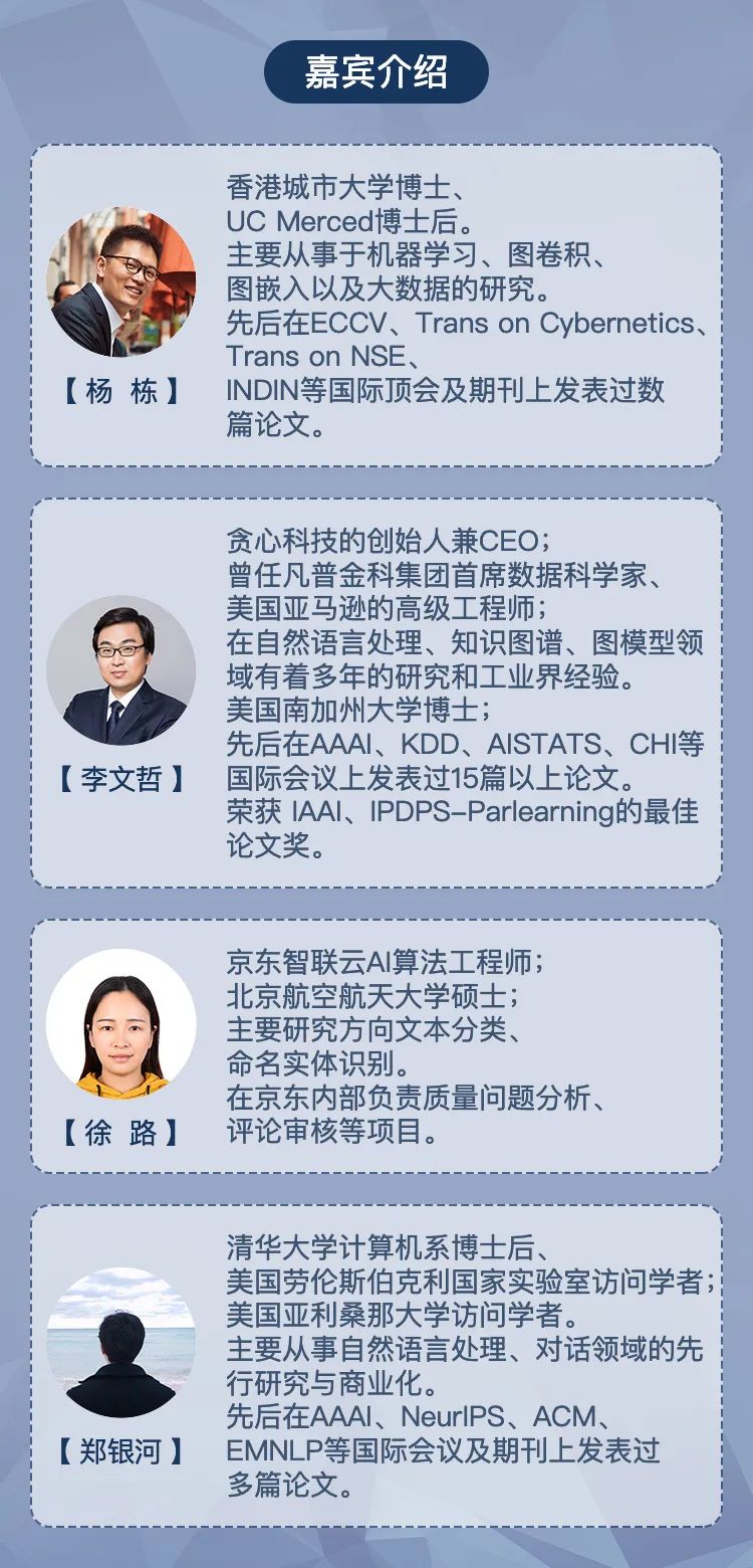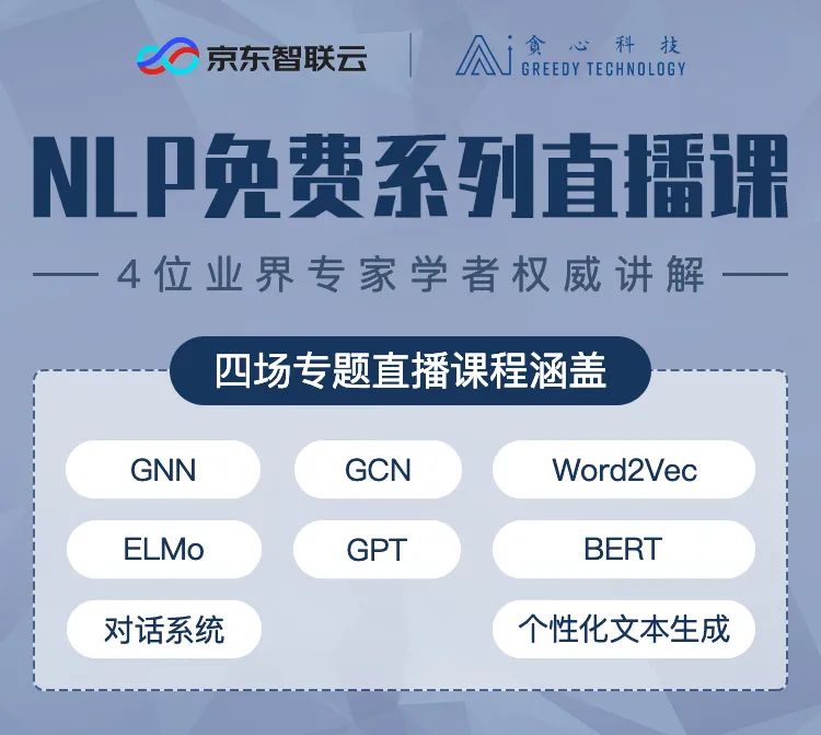 大家好,我是贪心学院的小编。自从今年二月份举办的火爆的BERT、XLNet专题课以来,已经三个月没有跟大家见面了。这一次我们又给大家带来了重磅级的系列公开课,由贪心学院和京东智联云联合打造,共四次公开课、为期两周时间,感兴趣的朋友们可以扫码加入。