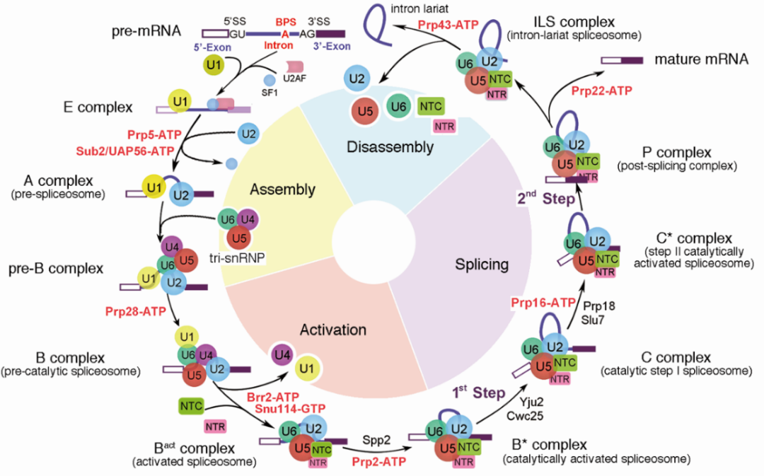 RNA 剪接是真核生物基因表达调控的重要环节之一,其化学本质是两步转酯反应。这种看似简单的化学反应在细胞中难以自行发生,而负责执行这一化学反应的是细胞核内一个巨大且高度动态变化的分子机器 —— 剪接体(spliceosome)。从 1977 年首次发现 RNA 剪接至本世纪初,科学家们通过免疫沉淀、基因敲除、交联质谱、建立体外剪接反应系统等研究手段,初步建立起剪接体的组装、激活与解聚的发生过程,以及蛋白与蛋白、蛋白与核酸之间的相互作用、相互调控等复杂的 RNA 剪接调控网络。在 RNA 剪接反应过程中,多种蛋白 - 核酸复合物及剪接因子按照高度精确的顺序发生结合、重排和解聚,依次形成预组装复合物 U4/U6.U5 tri-snRNP(U4/U6.U5 三小核核糖核蛋白复合物)以及至少 10 个状态的剪接体 E、A、pre-B、B、Bact、B*、C、C*、P 以及 ILS 复合物。剪接体每种状态的转变,都需要动力驱动蛋白 ——ATPase/helicase 对剪接体的结构重塑进行严格的调控(图 2),它们在催化剪接体构象的改变、控制 RNA 剪接的进程、对 RNA 进行检验和校对等过程中有着极其关键的作用,被誉为 RNA 剪接的 “分子时钟”。