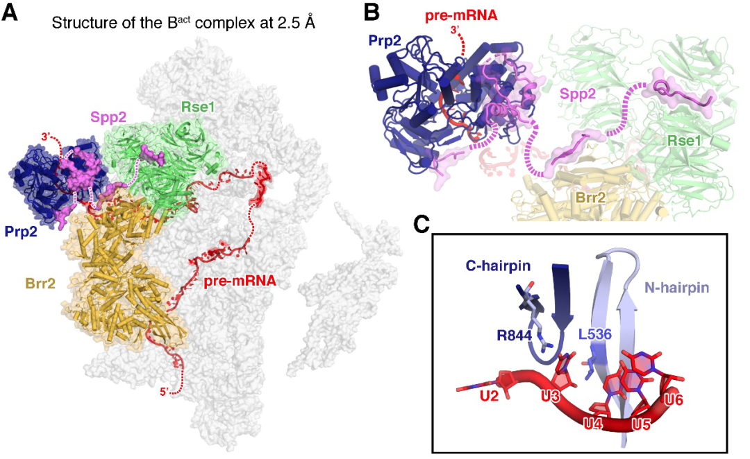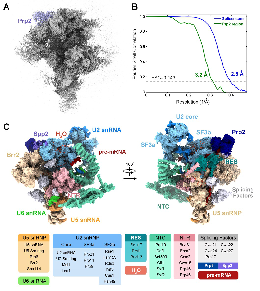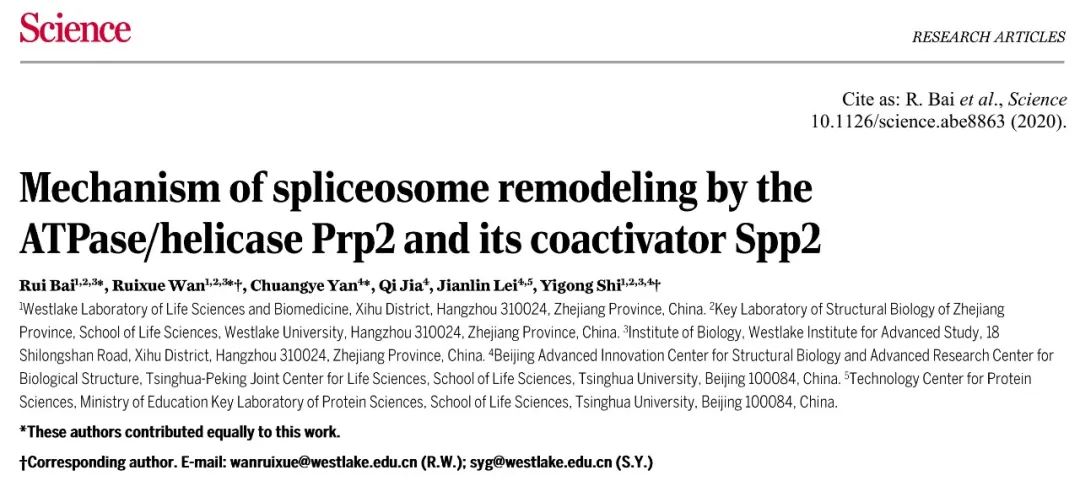 2020 年 11 月 27 日,清华大学结构生物学高精尖创新中心主任施一公教授研究组就剪接体的机理与结构研究,于《科学》(Science)杂志以长文形式再次发表重大研究成果(图 1)。这篇题为《ATP 水解酶 / 解旋酶 Prp2 及其激活因子 Spp2 催化剪接体激活过程中结构重塑的分子机理》(Mechanism of Spliceosome Remodeling by the ATPase/helicase Prp2 and its Coactivator Spp2)的论文报道了酿酒酵母处于激活状态的剪接体(activated spliceosome,定义为 “Bact 复合物”)2.5 埃的高分辨率电镜结构,此外还解析了 ATP 水解酶 / 解旋酶 Prp2 处于游离状态以及 Prp2 与其激活因子 Spp2 复合物的电镜结构。该结构是目前报道的最高分辨率的剪接体结构,首次展示了剪接体状态转变过程中的 “动力驱动” 蛋白 ——ATP 水解酶 / 解旋酶 Prp2 及其激活因子 Spp2 催化其重塑的结构基础,并结合大量生化实验,阐明了 Prp2 在前体信使 RNA 上单向移动的分子机理,回答了 Spp2 如何通过将 Prp2 锚定在剪接体上辅助其发挥重塑剪接体的功能等一系列重要科学问题。