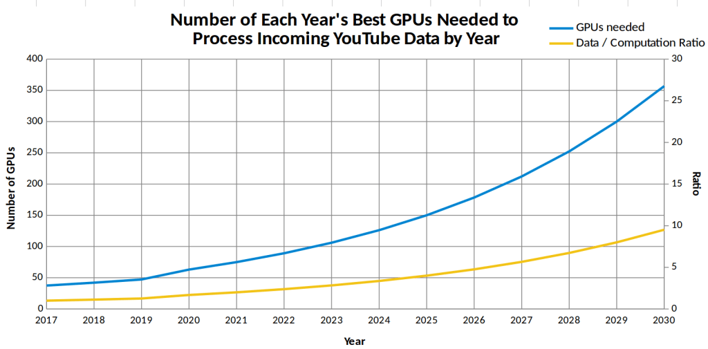 每年处理所有上传到YouTube数据所需GPU的数量(通过ResNet逐帧解决),以及数据和计算增长之间日益增长的差距。假设数据的增长频率是2年翻一倍,并且从2019年开始计算能力的增长的时间为3年和4年翻一倍。