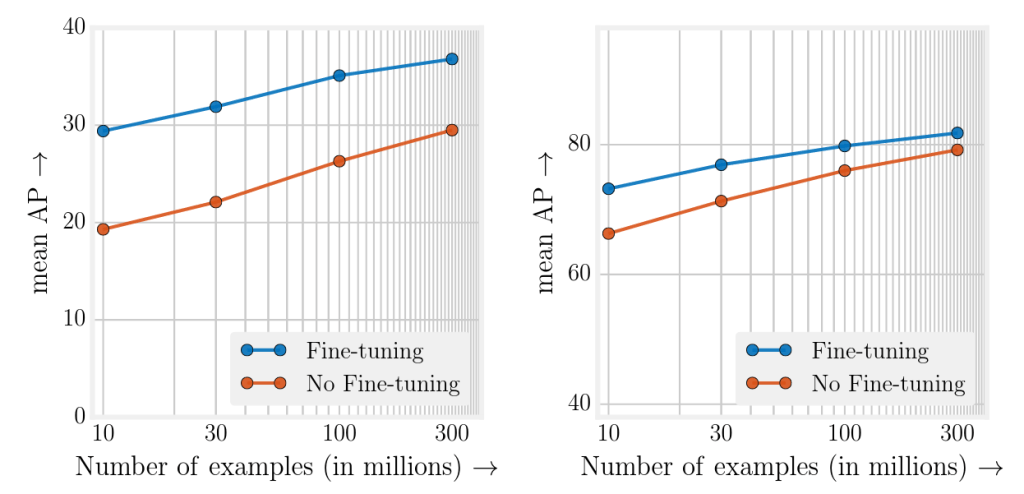 在JFT-300M的子集上进行预训练并在MS COCO上使用该预训练模型时,性能提高。左边是在training+0.8*dev set训练的结果,右边是只在 train set上训练的结果。图片来自论文:Revisiting Unreasonable Effectiveness of Data in Deep Learning Era