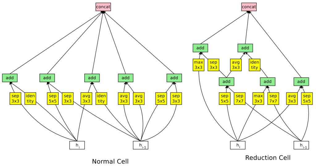 通过神经网络搜索(NAS)发现的架构令人印象深刻。最值得注意的是,网络从来没有选择使用标准的3×3卷积,虽然它完全可能这样做。相反,网络总是在常规卷积中选择可分离的卷积。另一个有趣的是使用平均池化。在这些单元格(或块)中,这是一个很常见的操作。还有一个令人震惊的事实,作者尝试手动添加到残差连接到最终块里,但这些残差连接降低了性能。