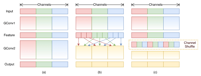 作者提高了卷积网络的效率,模型在使用更少的参数的情况下,实现了相同的分类性能,方法是:(1)group-wise 卷积和(2)通过 channel-shuffle 在这些 group 之间共享特征。
