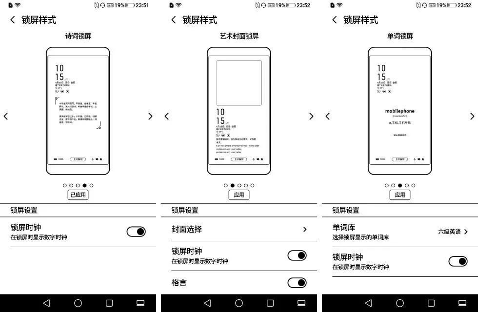 因为墨水屏不刷新时并不耗电,所以不需要息屏,因此 A5 做了一些有趣的锁屏功能,不光有诗词锁屏,单词锁屏可以帮你随时随地提升自己的文化修养,还有专门治愈现代人焦虑的鸡汤锁屏,在艺术封面的下面会显示中英双语的格言,让我感受到了来自家电厂商的正能量。