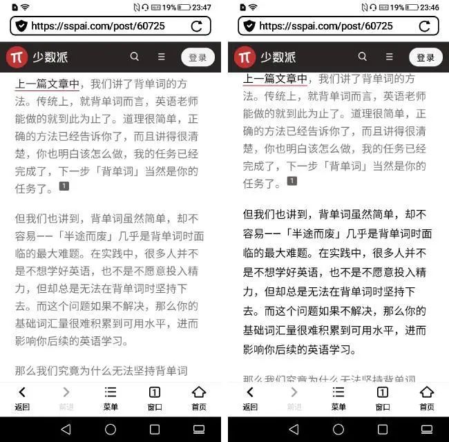 自带的 Eink 浏览器有一个高对比模式,可以将各种网页的字体针对墨水屏进行一定程度的优化。比如下面的网页,右边是开启高对比模式的截图,正文字体被调整成了黑色,在墨水屏上会看的更清楚。