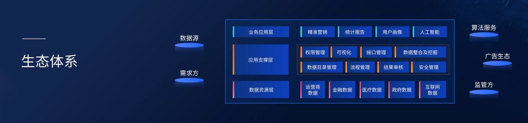 “利用可信区块链把整个环节连接起来,实现了数据融合,并保证了数据、算法、结果三者的安全性,相比传统的数据汇聚方式,可信区块链实现了完全的分布式方式来进行整个数据生态的打造,因为数据源不需要把数据上链或者上云,可以放在自己的机房,在需求方、算法方、投放方、监管方等整个生态打通的条件下,能通过安全多方计算实现对数据源、算法和结果的有效安全控制。“陈晓建说。
