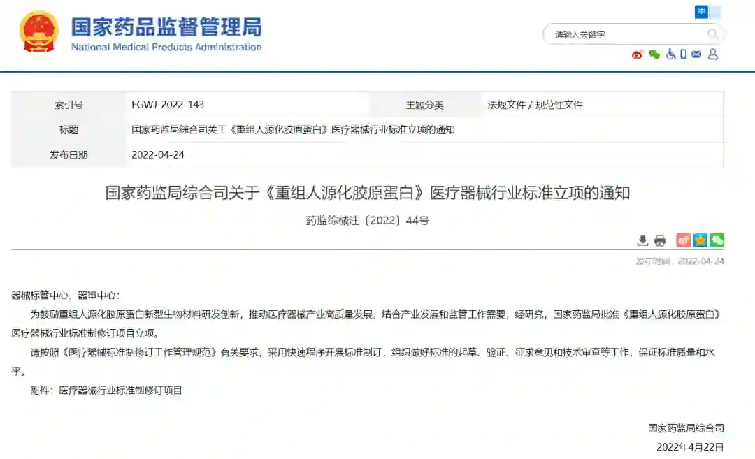 当一个技术驱动型的行业取得了大量关键技术突破时,建立标准、引导、规范行业正向有序发展已是迫在眉睫。今年8月1日,中华人民共和国医药行业标准《重组胶原蛋白》(YY/T1849-2022)正式实施。该文件由国家药监局提出,中国食品药品检定研究院归口。除了四川省药品检验研究院(四川省医疗器械检测中心)、山东省医疗器械和药品包装检验研究院等单位之外,巨子生物、锦波生物等主打重组胶原蛋白的科研企业凭借核心技术和科研实力也成为起草单位参与其中。