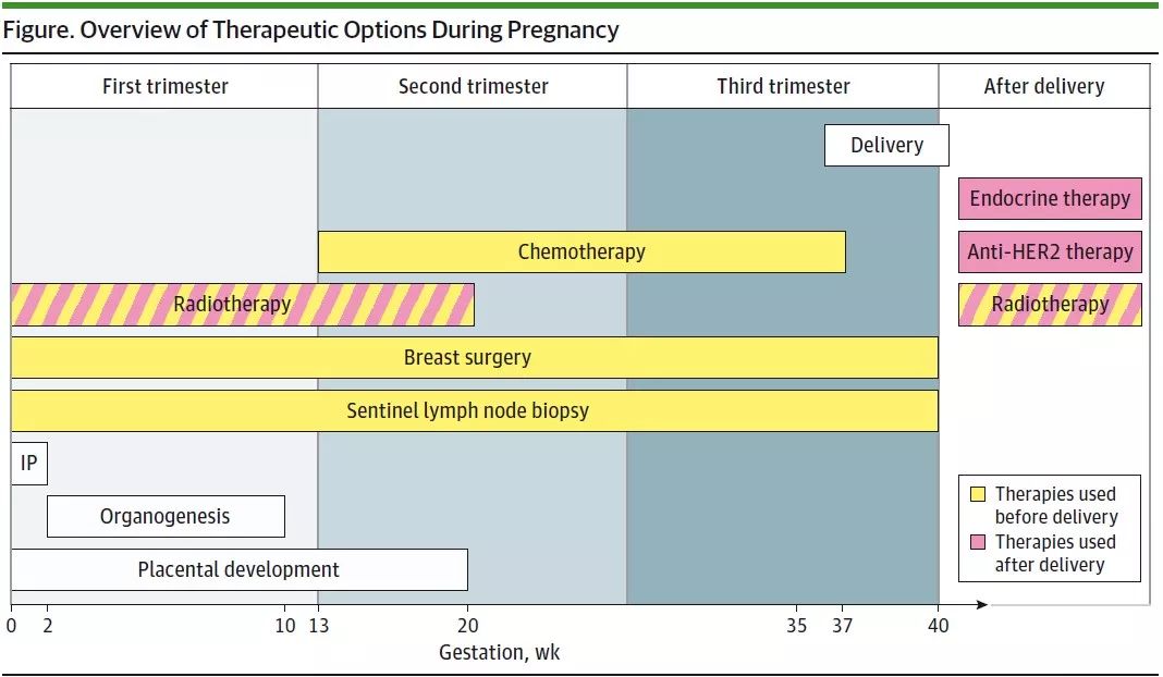 该患者同时存在特殊性,患者首诊时处于妊娠期,即妊娠期乳腺癌,对于妊娠期乳腺癌治疗应针对不同妊娠时期选择合理治疗。妊娠早期(孕周<12 周),细胞毒药物对胚胎的发育存在一定影响,因此细胞毒药物治疗应慎重,必要时可考虑推荐终止妊娠。妊娠中、晚期(孕周≥12 周)的患者可以在妊娠期进行安全的乳腺癌综合治疗,此阶段细胞毒药物对胎儿生长发育的影响较小。但是无论是曲妥珠单抗还是帕妥珠单抗,抗HER2治疗对整个妊娠期胎儿的安全性都没有证据支持,因此抗HER2靶向药物应用要慎重。具体治疗方案对妊娠期的影响及可行性如图4所示。但是临床实践中,对于身处妊娠期的乳腺癌患者,如何平衡胎儿健康与肿瘤治疗,基于指南和文献证据基础上,还需要慎重、综合考量。