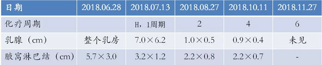 患者于2018年4月行超声引导下右乳肿物及右腋窝肿大淋巴结空芯针穿刺活检术,病理示:右乳浸润性微乳头状癌,SBRⅡ级。免疫组化:ER(-),PR(-),HER2(3+),Ki-67(25%+)。腋窝淋巴结内可见癌转移灶,呈微乳头状形态;免疫组化,ER(-),PR(-),HER2(3+),Ki-67(40%+)。