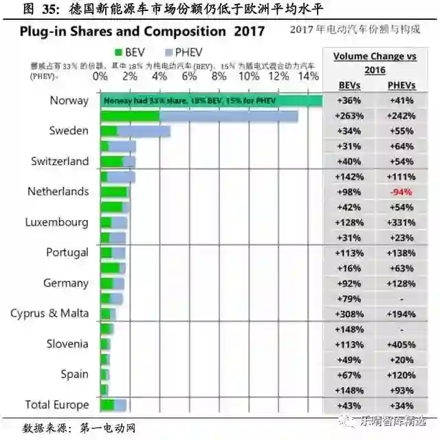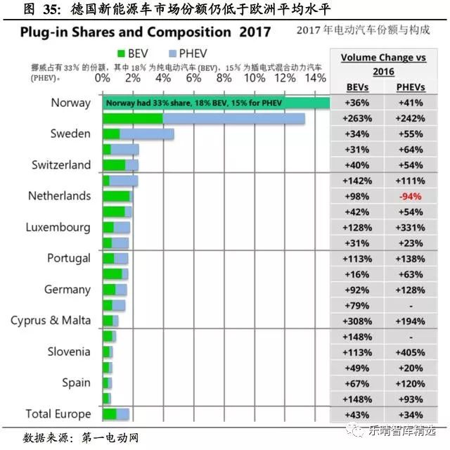17年德国国内新能源车市场份额达1.6%,仍未达到欧洲平均水平,但相比16年的0.6%已有巨大提升。17年德国车在大部分国家的传统车和新能源车占据市场份额十分接近。