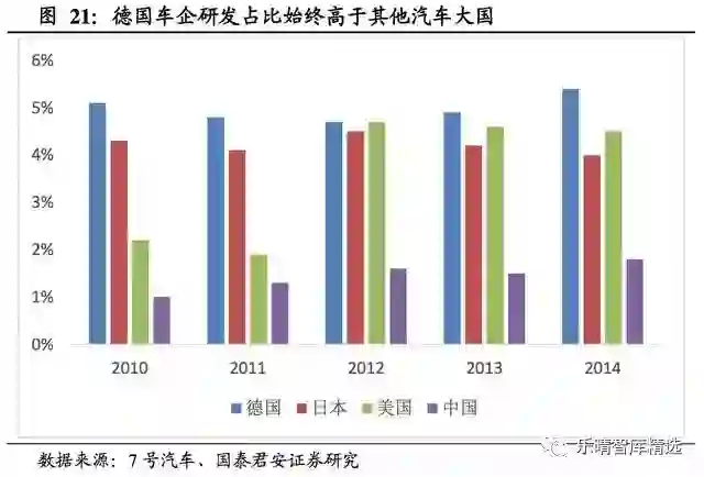 从研发占比来看,大众、宝马、戴姆勒均排在全球车企前五。同时,德国汽车零部件企业研发占比在全球前四中占据3席。实际上,德国车企研发占比始终强于美国、日本、中国等汽车大国。