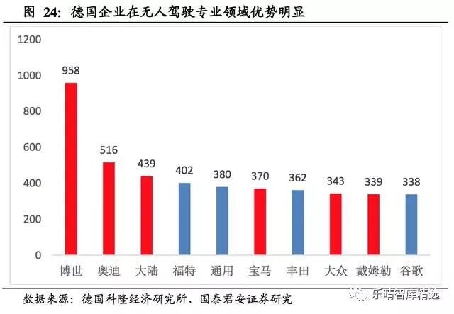 在前沿技术领域,德国车企优势更为明显,自 2010 年至 2017 年,全球 有 5839 项自动驾驶相关专利,德国企业拥有其中的 58%。