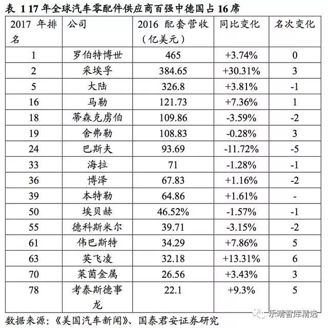 德国整车企业的发展和整个产业链上零部件公司的支持息息相关,在2017年《美国汽车新闻》发布的全球汽车零配件供应商百强排行榜中,德国零部件厂商有16家跻身百强。