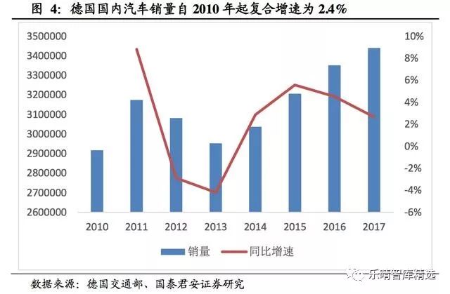 德国2017年汽车年销量达344万辆,位居全球第五。德国已经进入汽车行业成熟期,自2010年起至2017年,汽车销量复合增速为2.4%。