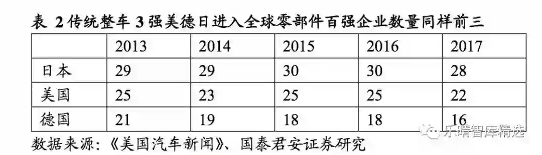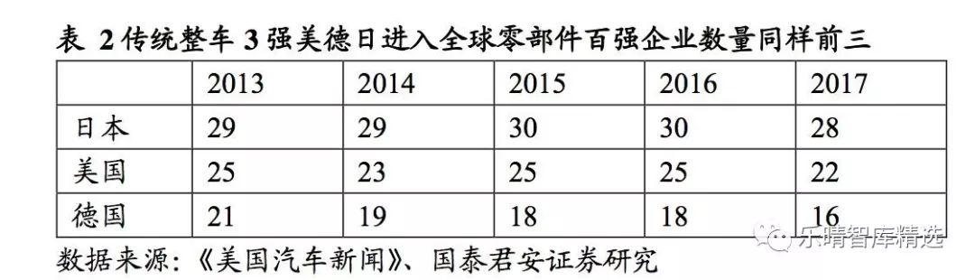 传统整车三强美国、德国、日本同样是汽车零部件传统三强,进入全球零部件百强企业数始终位居前三。