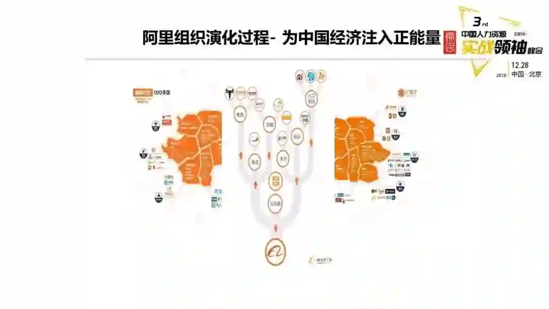 这是现在阿里巴巴所有的业务板块,我们可以看一下从1999年的三个部门发展到现在这个阶段,组织发生了翻天覆地的变化。