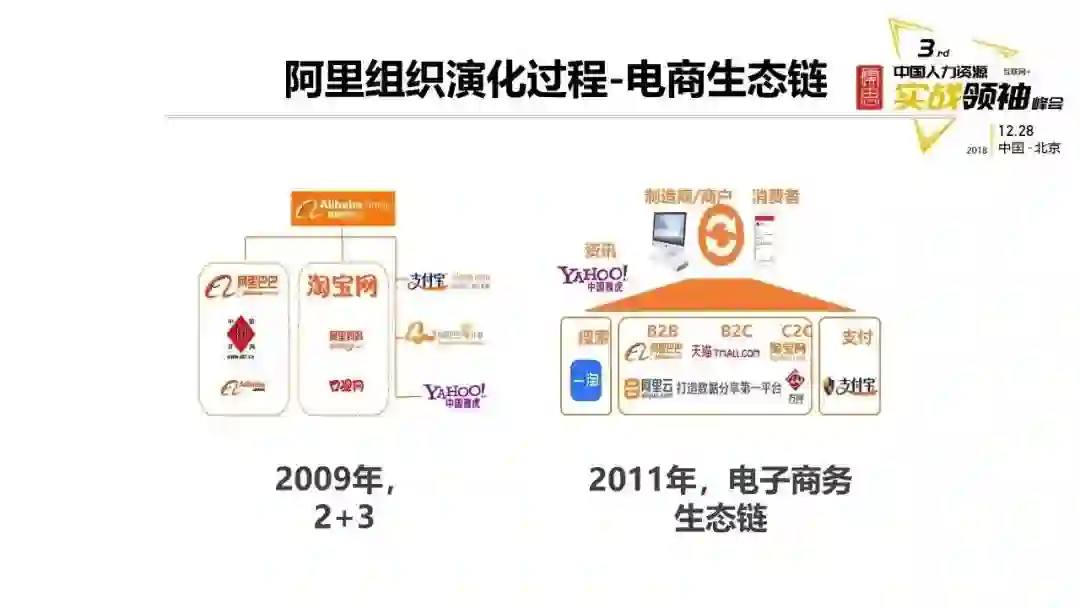 阿里的整个组织演变过程,从一个金字塔的组织架构慢慢变成网状,从不同部门之间的协作变成现在的项目小组——在合作基础上进行分工。