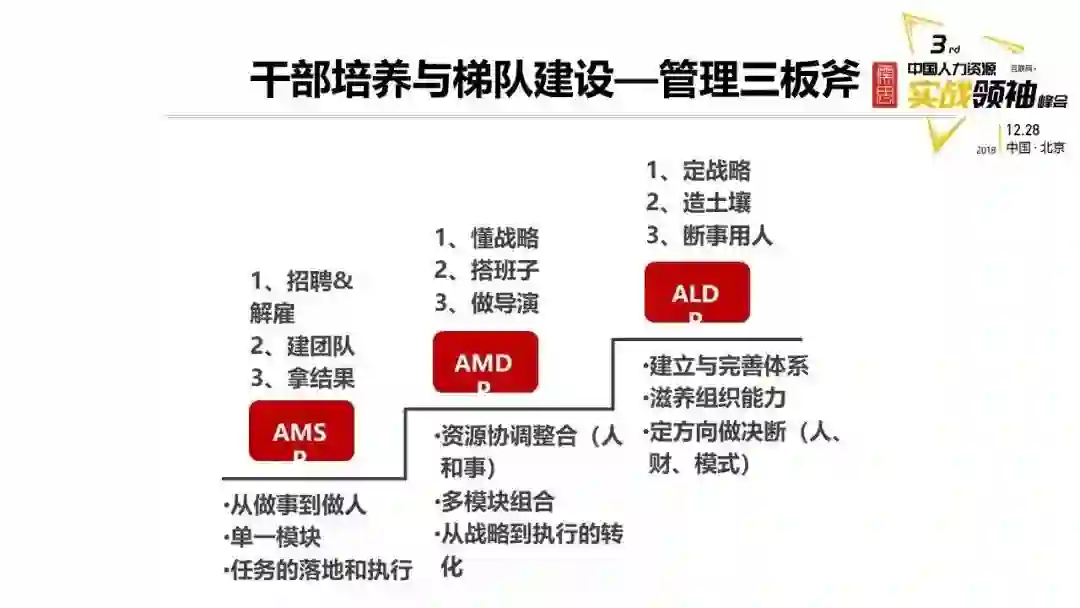 关于干部团队很简单就是“三把斧”——腿部力量招聘、解聘、拿结果;对于中层懂战略、搭班子、做导演;高管总裁要定战略、造土壤和断事用人。