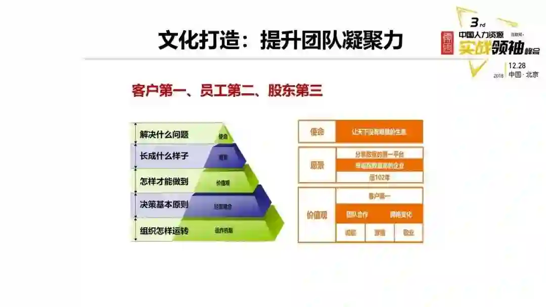 还有很关键的是我们怎么保障文化去落地,通过抓关键人群,关键场景和利益保障机制,通过这样的方法进行文化落地,时间关系不详细讲。