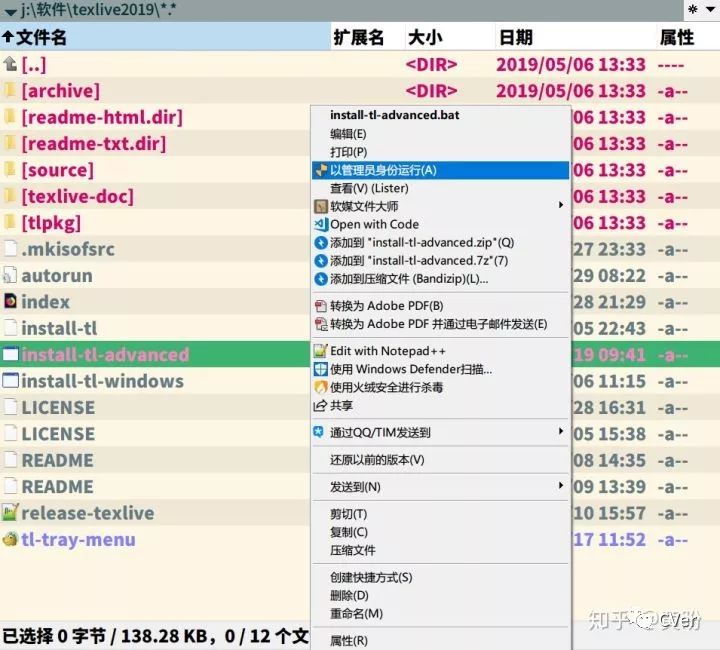 在解压出来的主目录中找到 install-tl-advanced.bat 文件,右击并以管理员身份运行。注意:文件夹路径里面不能有中文,不然打不开。
