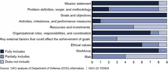 2018 年国防部 (DOD) 人工智能 (AI) 战略将 AI 定义为机器执行通常需要人类智能的任务的能力。战略和相关计划包括综合战略的一些(但不是全部)特征。例如,国防部的九项人工智能相关战略和计划不包括对资源和投资以及与采用人工智能技术相关风险的完整描述(见图)。发布指南以在未来与人工智能相关的战略中包含综合战略的所有特征,可以帮助国防部更好地帮助管理人员确保问责制和负责任地使用人工智能。