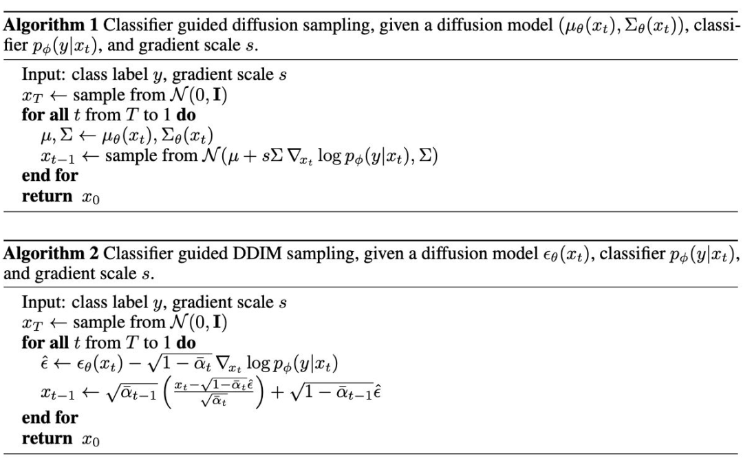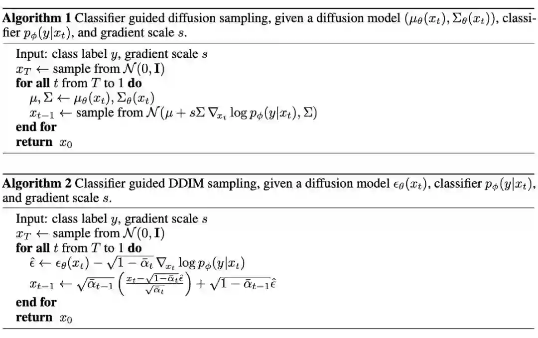 其中留意在 DDPM 下,每一步的均值估计加上了分类器引导的梯度,而在 DDIM 的框架下,原来的噪声估计也加上了分类器引导的梯度。