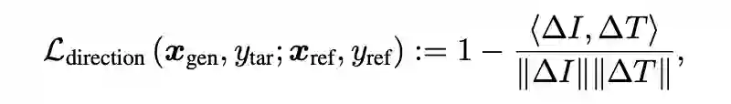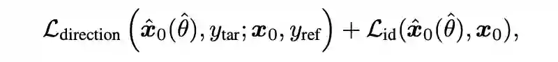 其中 delta_I 是图像编码器对生成图和原图的编码向量差,delta_T 是文本编码器对目标文本和原文本的编码向量的差。这是一个余弦距离的损失函数。而我们可以在扩散时引导我们的噪声或者模型使得其生成结果满足以下两个损失,一个是 CLIP 损失,一个是保证生成图和原图尽可能不要相差太远的重构损失。根据作者的实验发现,对模型微调的效果会比对噪声直接微调的效果更好一些。