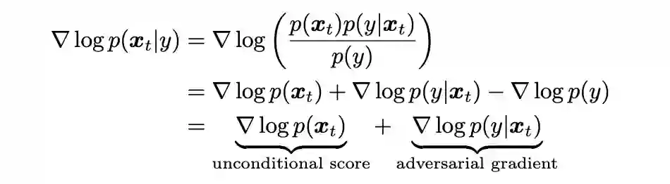 上式里我们很明显看到给定类别或条件生成的梯度可以看作是我们本来就已经在拟合的无条件梯度再加上一个分类器的梯度来得到(其中条件关于输入的求导为零)!换句话说对于一个先验分布,我们想要再次获得数据分布里在条件约束下的数据点时,我们实际只要在原来往数据方向的梯度方向上再额外添加一个分类器的梯度方向即可。