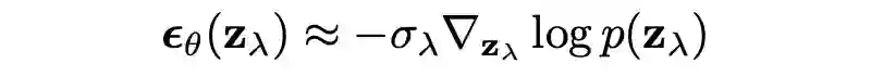 为了避免一个显式的分类器引导,笔者认为 classifier-free 这篇论文的核心思想是提出了一个隐式的分类器引导。以下是相关的推导:首先我们知道噪声的估计和对数据分布的梯度是成负系数比例的(直观来说,噪声使得原输入偏离了原数据分布,而去噪过程沿着往数据分布的最近梯度则刚好和噪声是反方向,具体推导可以参考笔者文章:从大一统视角理解扩散模型(Diffusion Models))。而这个关系在这篇论文里以这个公式形式给出: