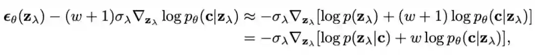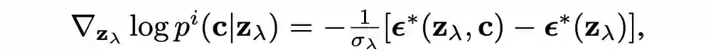 有了这个网络之后,我们想要生成符合原数据分布的点(例如图像或文本)时我们可以通过逐步往该网络的预测梯度方向行走来获得最终数据点。但这样有一个问题是这样的无条件生成我们无法做到条件生成,如指定图像类别是猫或狗来生成具体类别的结果。但根据以上的直观理解,我们可以用贝叶斯定理来将条件生成对输入的对数梯度拆解一下 [1]: