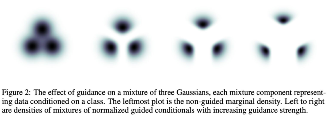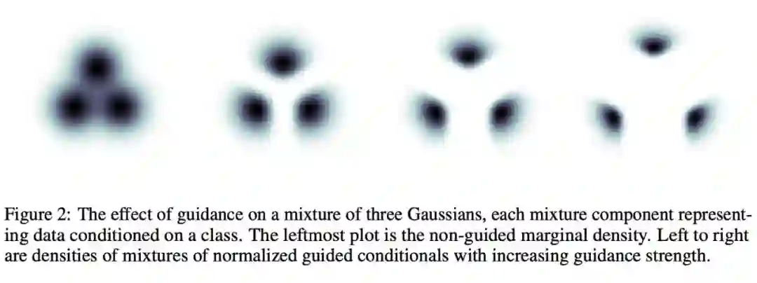 下图是 classifier-free [4] 这篇论文里给出的形象例子。对于一个来自于三个高斯分布混合而成的分布,我们通过分类器引导的采样过程导致了采样结果严重受限于该分布的局部领域,且分类器引导强度越强,远离其他类别的质心的表现越明显,使得结果越加集中在局部空间。