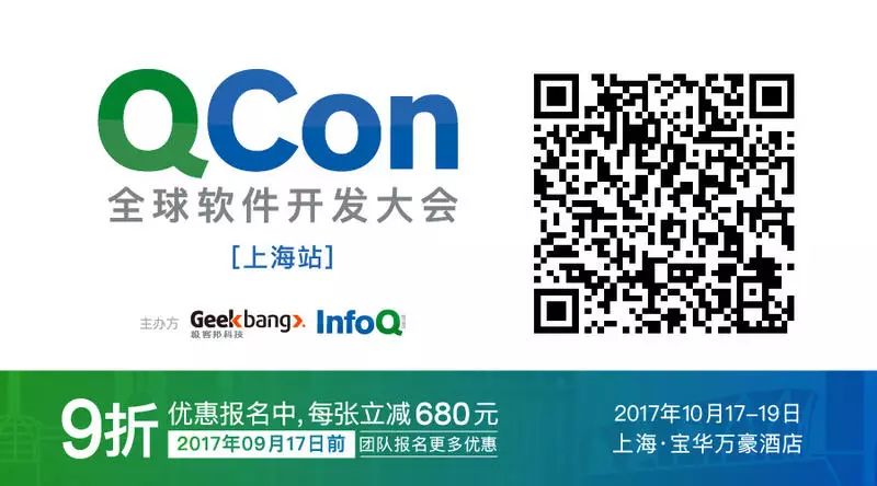 更多关于精彩技术专题请关注 QCon 全球软件开发大会,QCon 上海站目前 8 折优惠报名中,2017 年 09 月 17 日前,立减 680 元,团购报名更多优惠~点击「 阅读原文 」跟技术大咖零距离。欲购票或咨询问题可联系购票经理 Hanna ,电话/微信:15110019061。
