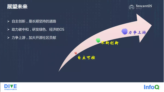 最后我们来看一下腾讯操作系统的未来规划。作为一家大型的科技公司,自主创新肯定是我们长期坚持的道路,一方面我们要做自主可控的操作系统,保证 OS 供应链的安全性,另一方面我们也需要持续不断地创新,让操作系统这棵老树能够不断绽放出新的花朵。其次为了助力国家的碳中和战略,我们会持续优化操作的资源利用率,将 TencentOS 努力打造成绿色经济的 OS。最后作为操作系统的开发者,力争上游或者上游优先是我们的使命,我们会同全球的 OS 开发者一起不断贡献自己的力量,加大开源社区的贡献。