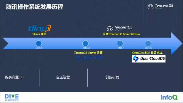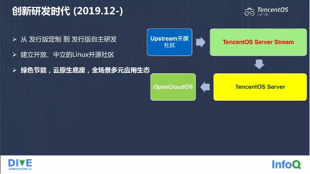 十年操作系统自主运营经验,让我们对 OS 产品研发有了更深厚的底气,有了更扎实的技术基础,这十年我把它叫做自主运营时代。2019 年,我们对外开源了我们的操作系统产品。2021 年,我们角色进行了一个大的转变,之前是发行版定制,现在变成了发行版自主研发。发行版自主研发肯定是 OS 研发人员一直以来的梦想,我们不再基于开源的 Linux 发行版,而是基于 Upstream 开源社区,或者我们自研从头开始构建操作系统发行版 TencentOS Server Stream,基于这个版本再去研发商业版本 TencentOS Server,研发社区版本 OpenCloudOS,OpenCloudOS 社区是我们发起的一个开放中立的 Linux 开源社区,我们希望通过建立这样一个开放平台,能够联合公司内外的开发者,最终把我们这个操作系统共同打造成一个绿色节能的操作系统,能够充当云原生的底座、基石,共建全场景、多元应用生态。