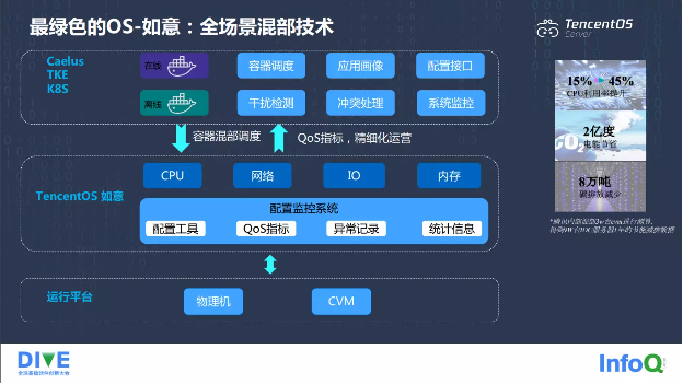 TencentOS Server 在节能降耗领域取得突破,推出如意大规模全场景混部技术。随着语音的快速发展,IDC 的规模不断扩大,投入越来越大。有研究显示,服务器成本占比高达 69%,每年各大互联网厂商服务器支出投入非常大,与此形成鲜明对比的是服务器的平均利用率却很低,通常业界的 CPU 利用率只有 15% 左右。这就是我们研发如意这款大规模容器集群混部技术的初衷。如意包括 CPU、网络、IU、内存四大模块,针对四种服务器资源将用户的离线和在线任务部署到同一台服务器上,既能保证在线业务的服务质量,又能有效提升资源的利用率。我们做了一些统计,比如按混部三万台机器进行测算,CPU 利用率可以从 15% 提高到 45%,大概每年可以节省两亿度电,减少碳排放达到八万吨的级别。