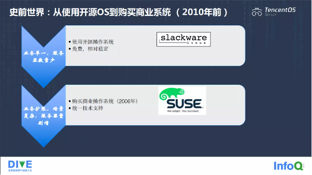 在腾讯发展初期,公司业务比较单一,服务器数量比较少,操作系统很多潜在缺陷基本上不会爆发,因此,我们就选择了开源操作系统,可以满足当时的需求,并且不需要花费额外的成本,所以公司当时就选择了 slackware 作为服务器操作系统。