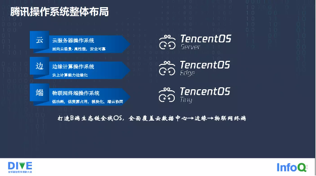互联网的下半场是属于产业互联网,也就是说要实现人和设备、设备和设备、设备和服务之间的连接,作为整个公司业务的基石和服务器的灵魂,我们的操作系统也完成了新一轮的变革,从单一的服务器操作系统,拓展到覆盖云数据中心、边缘、物联网终端,提供基于业务场景化的全栈 OS 布局。TencentOS Server 是服务器操作系统,面向云数据中心,主要特点是高性能、安全可靠;TencentOS Edge 是边缘计算操作系统,能够将云上的计算能力边缘化;TencentOS Tiny 是物联网终端操作系统,它的特点是小而精,比如低功耗、低资源占用、模块化。我们通过这样一套操作系统布局,希望能够打造我 2B 端的生态链全栈 OS,能够全面覆盖云数据中心、边缘物联网终端,实现产业互联网的操作系统布局。