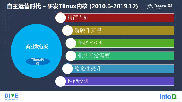 业务对底层操作系统的支持需求也不断提升,自研操作系统显得非常必要。因此 2009 年,公司就组建了操作系统团队,专门负责公司服务器操作系统的研发和底层的运营支持,自研操作系统并不是所有的一切都从头开始,把所有的商业操作系统开源操作系统都撇开从头去造,这样投入会非常大。俗话说的好,站在巨人的肩膀上飞得更高,我们没必要重复发明轮子,所以从最开始我们使用的发行版还是 SUSE,只是在上面做了我们内核的定制,取名为 Tlinux 内核。我们结合公司业务的需求和使用场景进行了一些定制,比如: