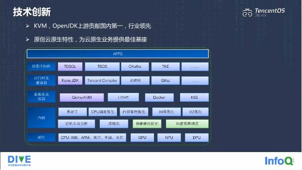 在技术创新方面,我们也做了很多。这张图是整个操作系统的框架图。内核一方面是要去适配更多的硬件,比如 CPU、GPU、NPU、DPU,另外我们也做了很多方面的优化,比如 CPU 调度优化、内存管理优化、网络优化、I/O 优化,还有云原生优化。我们还开发了宕机自动分析、热补丁功能、虚拟化。在虚拟化容器方面,我们做了很多原创的云原生特性和优化,在运行时和编译器方向,我们有 Kona JDK、Tencent Compiler 加速库。在应用中间件方面,腾讯有非常多的应用,比如 TDSQL、TBDS、CKafka、TKE。