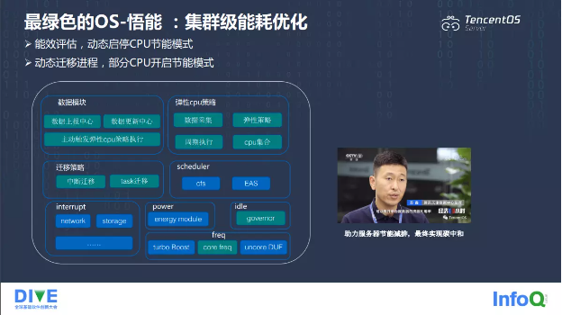 为了进一步降低数据中心的能耗,我们还开发了悟能系统。悟能系统是一套集群级能耗优化方案。它能够对集群进行能效评估,动态启停 CPU 的节能模式,还支持动态迁移进程,部分 CPU 开启节能模式。它包括数据模块、弹性 CPU 策略、迁移策略,调度等等,通过能耗优化降低服务器的能耗,为实现碳中和同样做出了很大的贡献。