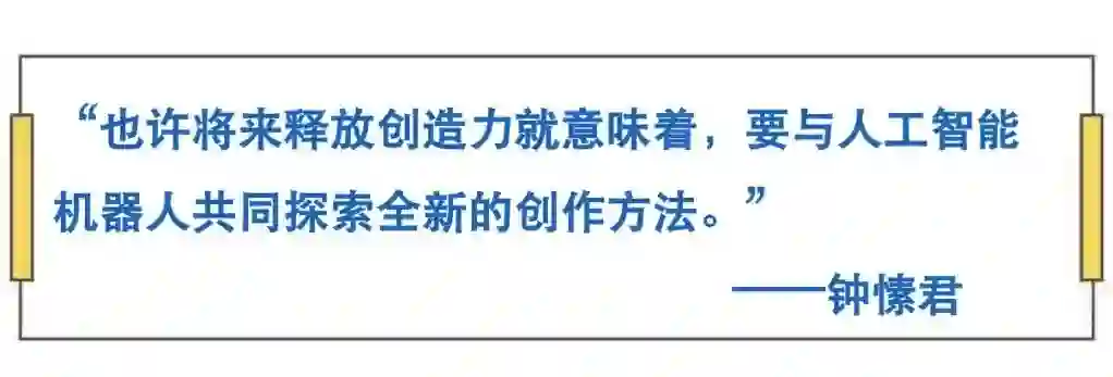钟愫君表示,将人工智能机器人与艺术相结合,有助于我们更深入地思考何为人类、何为机器,而人机协作是为两者共同探索无限创造力的关键所在。她在这一探索过程中思考:“也许将来释放创造力就意味着,要与人工智能机器人共同探索全新的创作方法。”钟愫君极具探索性的跨学科艺术证明,当艺术和技术交融时,将会碰撞出创造力的火花。此外,这也提醒我们要敢于尝试突破日常工具的界限,不断进行探索和创新。