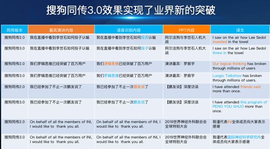 相比之前的版本,搜狗同传3.0 有这样三个特点:一是更自然,以往同传是单纯的语音识别,而搜狗同传 3.0 会模拟人工同传的工作方式,增加视觉和大脑扩散知识点的功能,形成一套全方位的感知系统;二是更专业,之前同传的模型是通用的,但搜狗同传 3.0 形成了实时专属的定制加强能力,能够实时捕捉 PPT 内容,补充演讲专业领域知识,并针对每一个演讲进行模型定制,提升同传效果;三是更智能,以往模型训练需要一个被动学习的过程,而现在搜狗同传 3.0 可以自动学习 PPT 内容,自动捕捉海量词汇,确保同传质量。