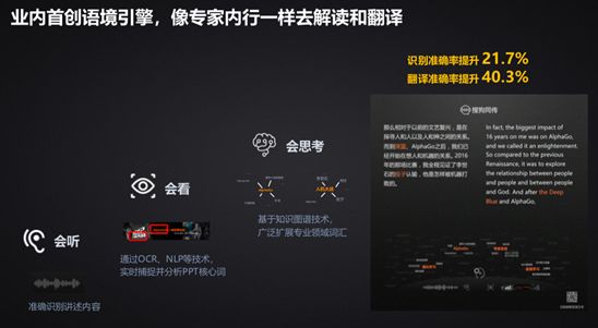 具体来说,搜狗同传 3.0 首创语境引擎,让翻译系统会听、会看、会思考。